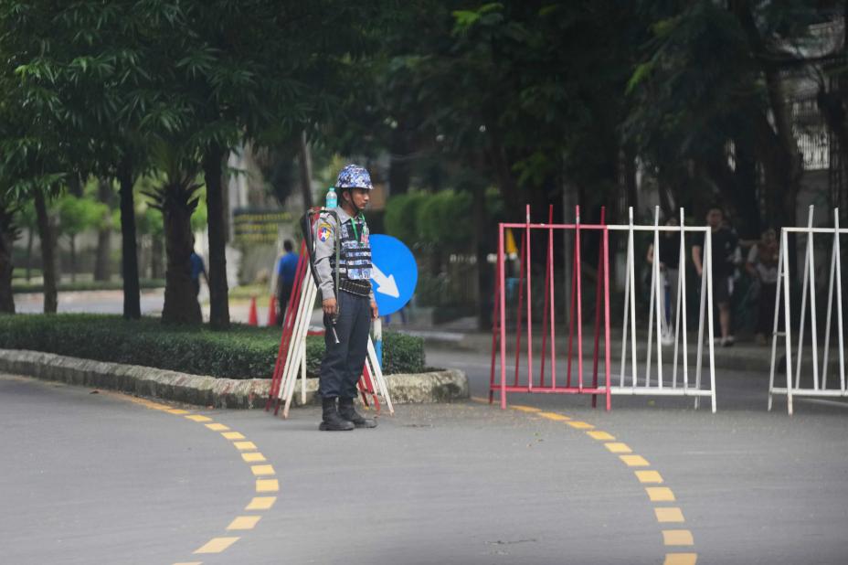 En politimann i Myanmars største by Yangon under markeringen av en helligdag, martyrdagen, 19. juli i år. Foto: AP / NTB