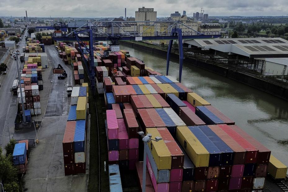 Fra en konteinerterminal i Frankfurt. Tysklands DAX-indeks falt med 1,7 prosent etter tollnyhetene. Michael Probst / AP / NTB