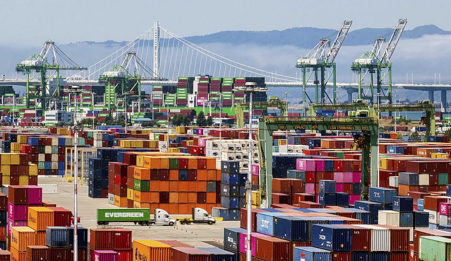 Fraktcontainere fyller terminalområdet i havnen i Oakland torsdag 31. juli 2025. Foto: Noah Berger / AP / NTB
