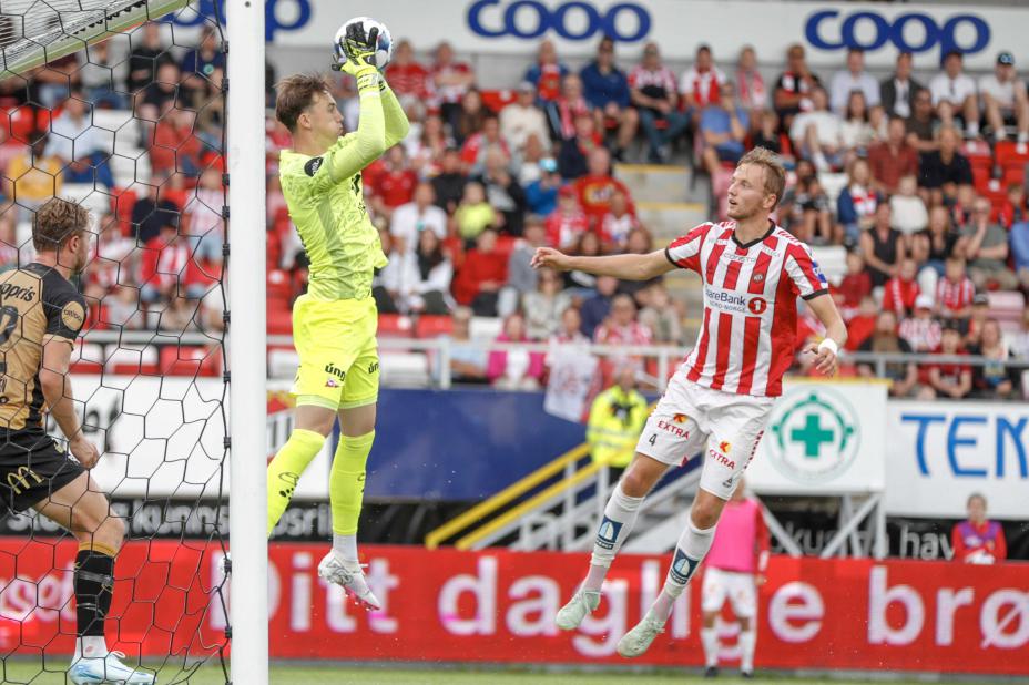 Fredrikstads keeper Valdemar Birksø storspilte mot Tromsø. Foto: Rune Stoltz Bertinussen / NTB