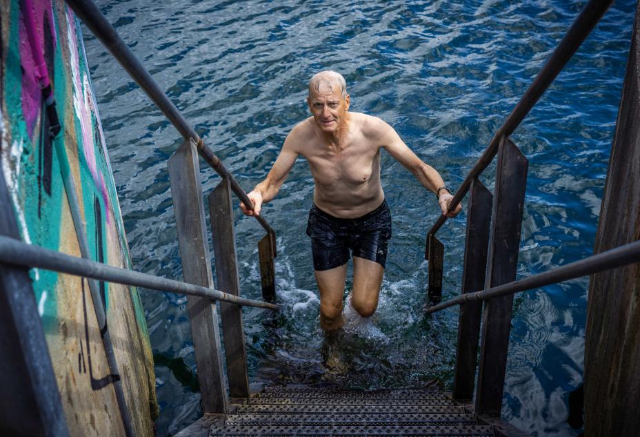 Statsminister Jonas Gahr Støre (Ap) tok seg tid til en dukkert på brygga i Larvik tirsdag. Det er ikke klart hvor varmt vannet var da statsministeren badet. Foto: Ole Berg-Rusten / NTB