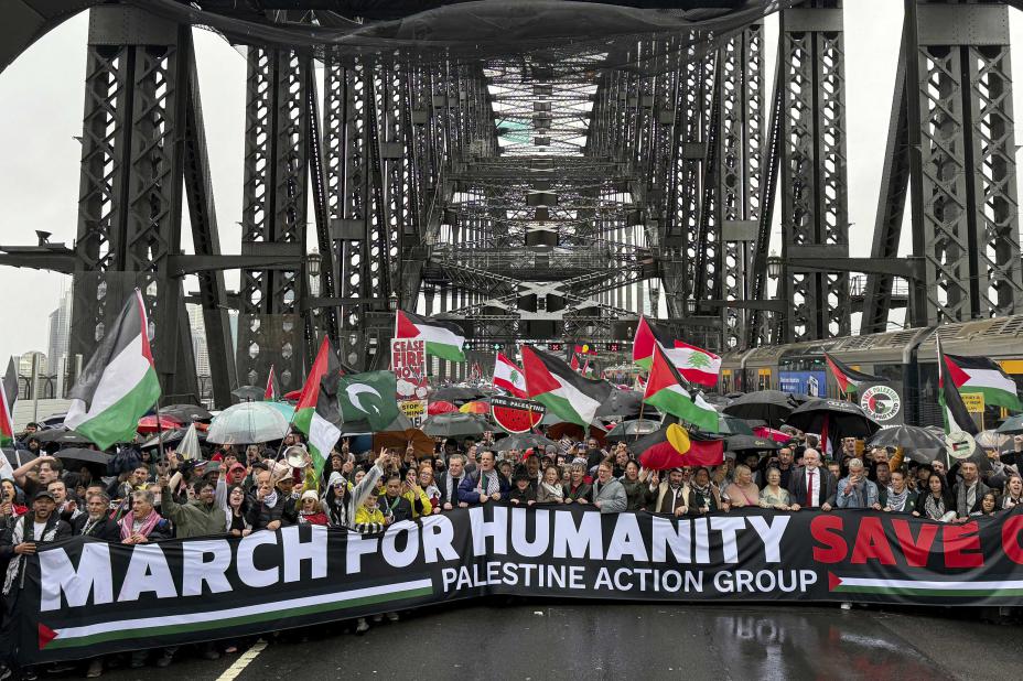 Krig og konflikter: Arrangementet Marsj for menneskeheten har søndag samlet store folkemengder i øsende regnvær i Sydney.