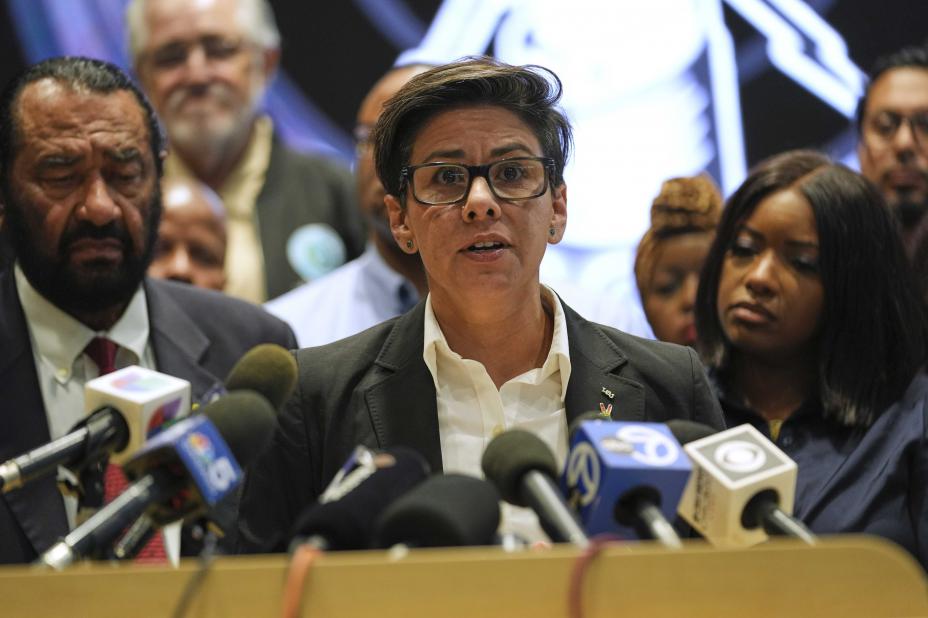 Texas-demokrat Jessica González omgitt av kolleger på en pressekonferanse hos Demokratene i Illinois mandag. Foto: Nam Y. Huh / AP / NTB