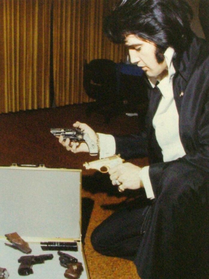 Elvis Presley var våpenglad. Her holder han sin gullbelagte Walther PPK-pistol, inngravert med mottoet «TCB» (taking care of business. Foto: AP /NTB