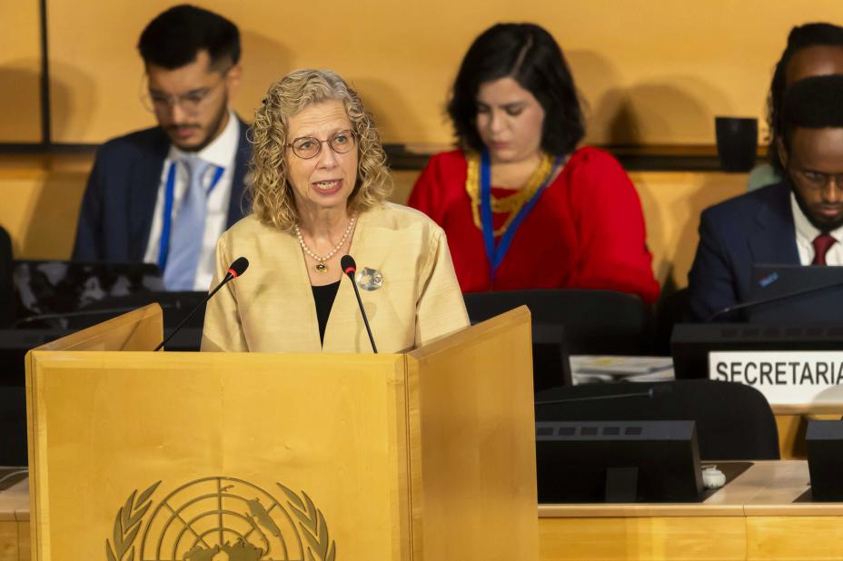 Inger Andersen, leder for FNs miljøprogram, på talerstolen i Genève under åpningen av plastforhandlingene tirsdag. Foto: Keystone / AP / NTB