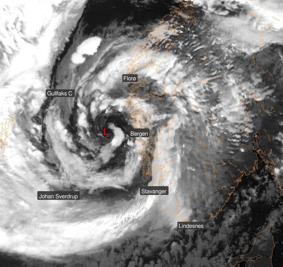 Kart fra Meteorologisk institutt som viser stormen Floris sett ovenfra i dag klokken 05:33. Utover dagen skal vinden spakne, men det vil fortsatt blåse en god del. Foto: Meteorologisk institutt / Handout / NTB