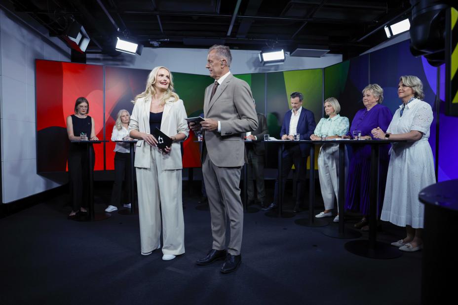 Programledere Maria Madeleine Knutsen og Gunnar Stavrum under Nettavisen og Amedias partilederdebatt i Nettavisens TV-studio onsdag kveld. Foto: Jonas Been Henriksen / NTB