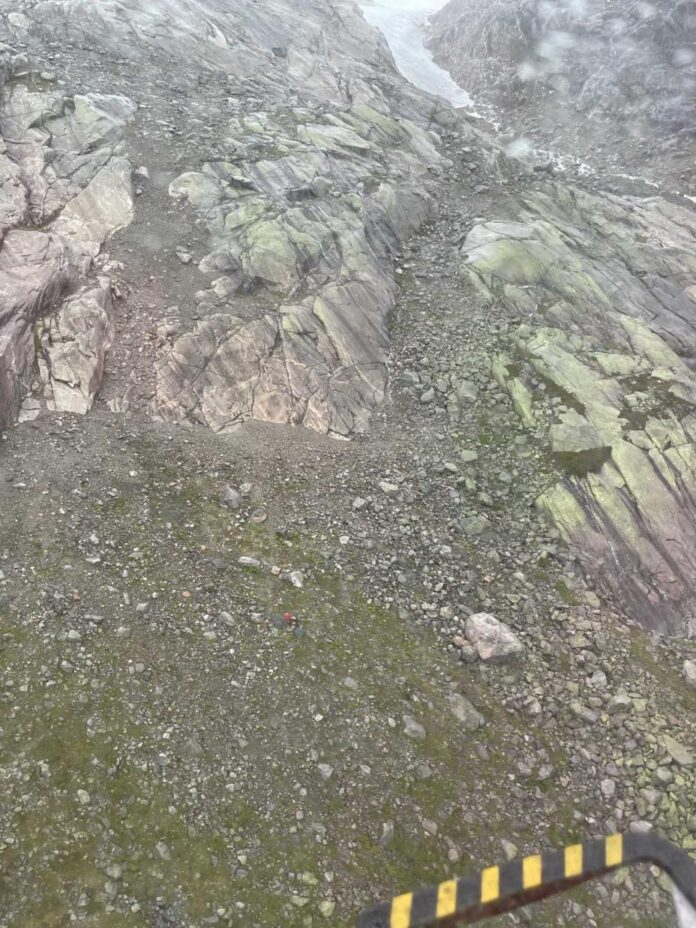 Hovedredningssentralens helikopter fant til slutt Alec Luhn i en steinur ved Folgefonna. Skadene hans ble betegnet som alvorlige. Foto: Annika Byrde / NTB