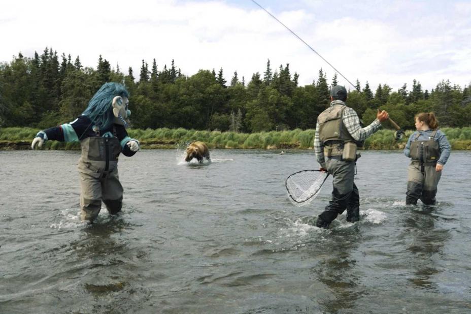 Seattle Krakens team fikk et nærmøte med en bjørn i Alaska. Til venstre er maskoten Buoy. Foto: Seattle Kraken via AP / NTB