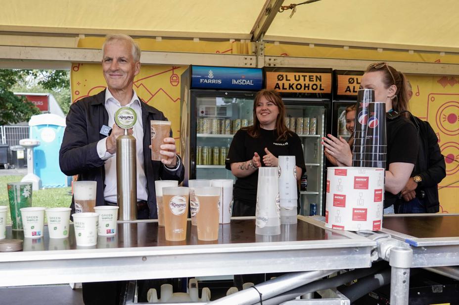 Statsminister Jonas Gahr Støre (Ap) under et besøk på Øyafestivalen i fjor sommer, der han fikk tappe øl.
