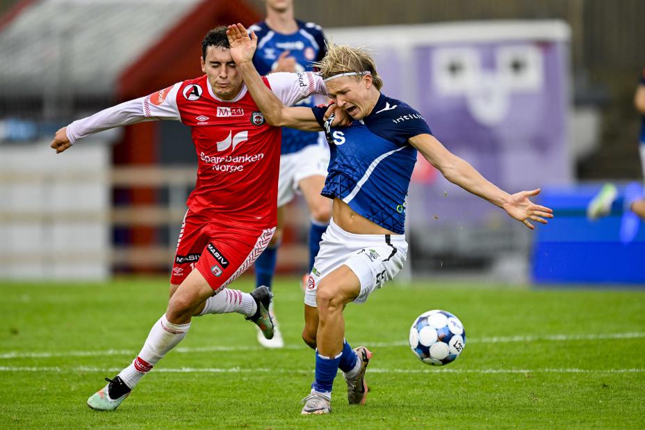 Brynes Duarte Moreira og KFUM Oslos Simen Hestnes under eliteseriekampen i fotball mellom Bryne og KFUM Oslo på Bryne stadion.