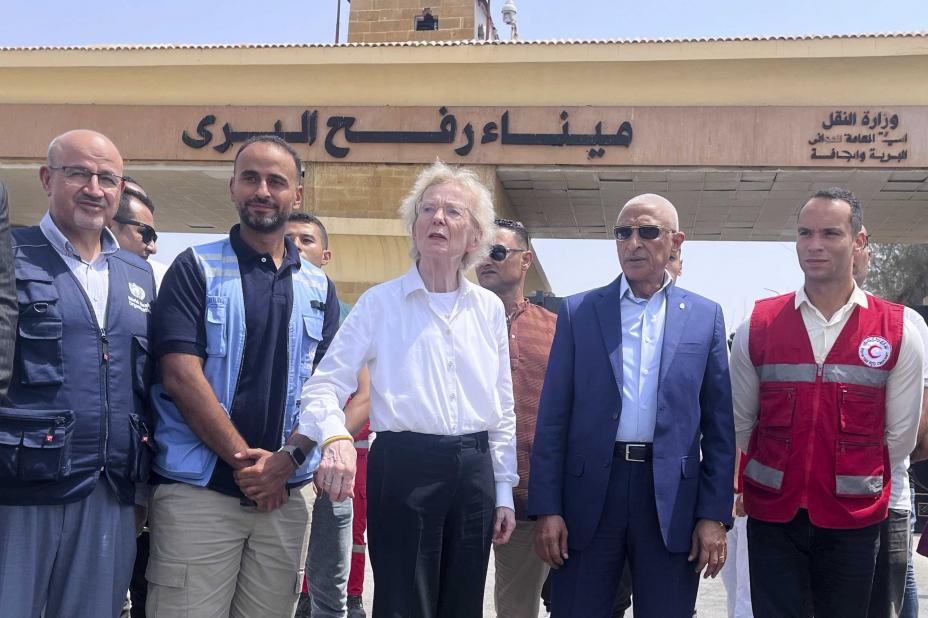 Tidligere president Mary Robinson (midten) i Irland, besøkte Rafah-grenseovergangen mellom Egypt og Gaza sammen med delegasjonen fra «The Elders». Gruppen advarer om folkemord i Gaza. Foto: Mohamed Arafat / AP / NTB