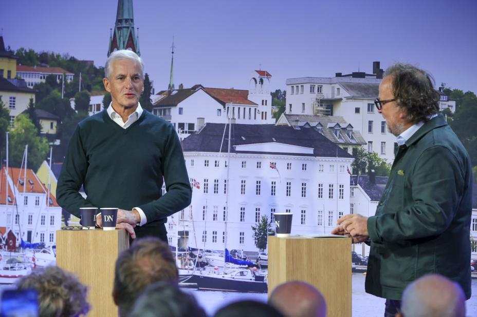 Norge har ikke fått en dårligere tollavtale med USA enn det EU har fått, mener statsminister Jonas Gahr Støre i samtale med DNs Frithjof Jacobsen på Arendalsuka. Foto: Elisabeth Grosvold Altenborg / NTB