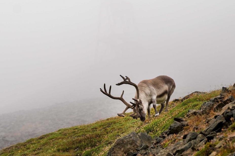 Et reinsdyr ved Longyearbyen på Svalbard. Forskere er redd vi kommer til å miste en stor andel av reinsdyrene våre i de arktiske områder på grunn av klimaendringer. Foto: Lise Åserud / NTB