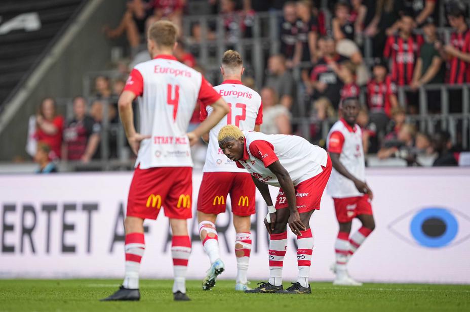 Fredrikstad er ute av dansen om en plass i europaligaen etter et klart sammenlagttap for Midtjylland. Her tar Maxwell Woledzi seg til knærne. Foto: Bo Amstrup / Ritzau Scanpix / NTB