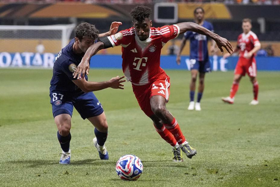 Kingsley Coman i duell med PSGs João Neves i klubb-VM tidligere i sommer. Foto: Brynn Anderson / AP / NTB