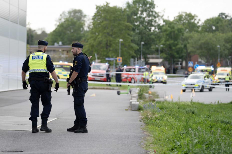 Politi utenfor moskeen i Vivalla-bydelen i Örebro etter skytingen under fredagsbønnen. Foto: Filip Grönroos / TT / NTB