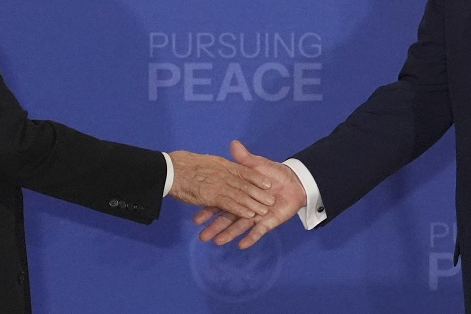 President Donald Trump håndhilser på Russlands president Vladimir Putin under en felles pressekonferanse på Joint Base Elmendorf – Richardson i Alaska. Foto: Jae C. Hong, AP / NTB