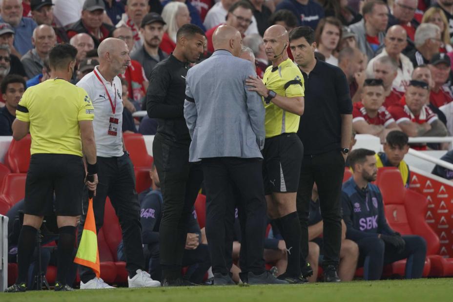 Dommeren Anthony Taylor snakket med blant andre Liverpools manager Arne Slot da kampen var stanset i en periode. Foto: Ian Hodgson / AP / NTB.