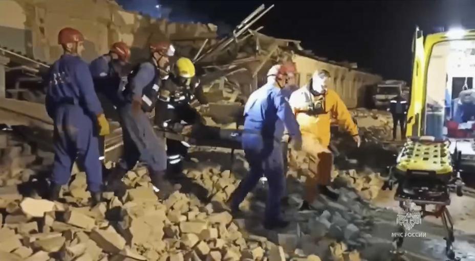 Redningspersonell bærer en av de skadede ut av ruinene av fabrikkbygningen i Rajazan-regionen der det brøt ut brann fredag. Foto: Det russiske krisedepartementets pressetjeneste / AP / NTB