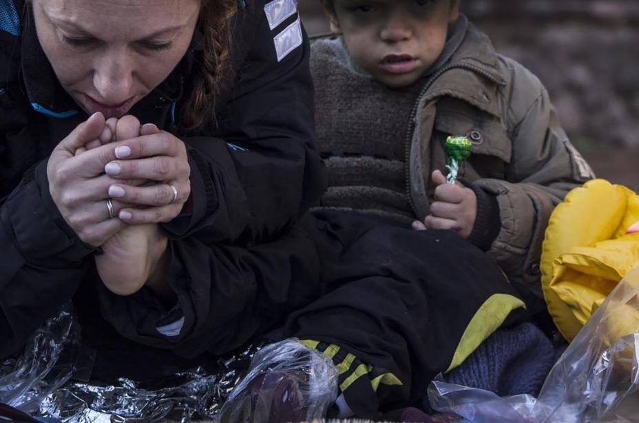 – Jeg må tro på at det nytter å holde likegyldigheten unna, sier Kristina Quintano (t.v.), her fotografert mens hun varmer en frossen flyktninggutt. Foto: Privat / Handout / NTB
