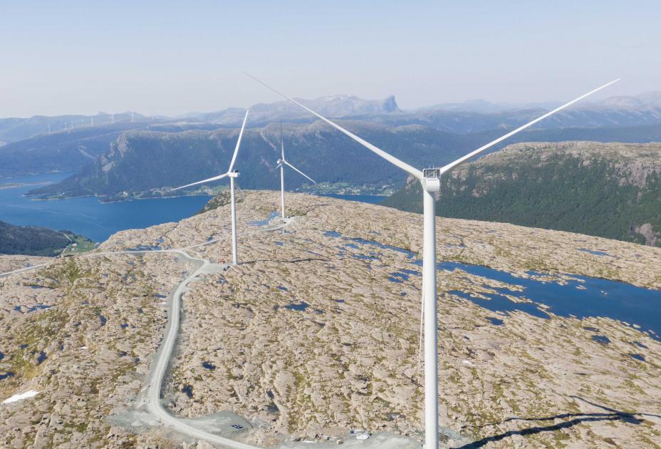 Guleslettene vindpark like ved Florø er et av vindkraftverkene som har fått norske eiere det siste året. Her fra monteringen i 2020. Nå er nesten halvparten av norske vindkraft på norske hender. Foto: Tore Meek / NTB