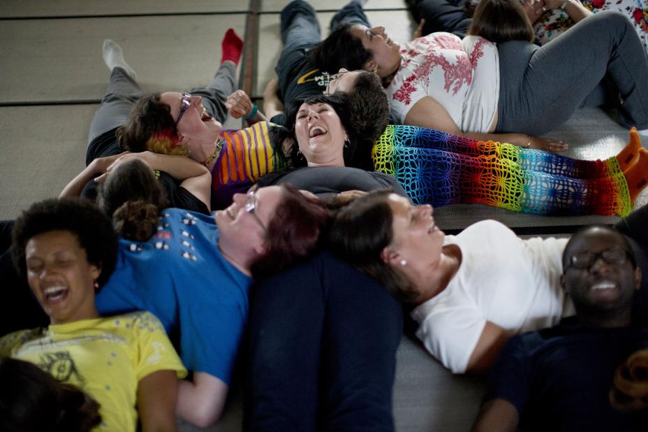 Ny studie viser at latterterapi – latter som fysisk øvelse – har stor og god effekt på angst og øker følelsen av tilfredshet med livet. Men i Norge brukes det ikke så mye. Latteryogatime i St. Albans i England. Foto: Matt Dunham / AP / NTB