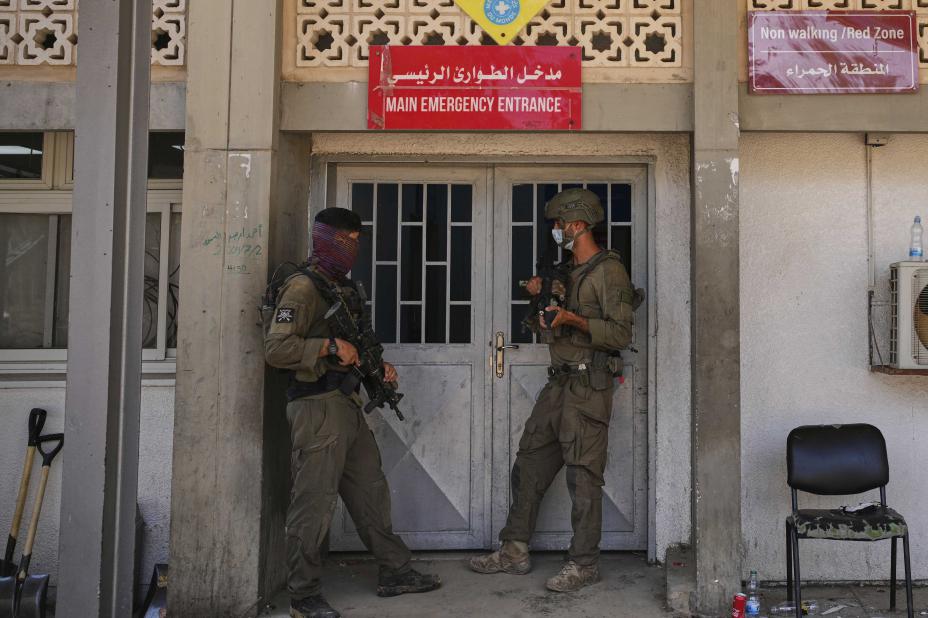 Israelske soldater går i stilling utenfor sykehuset i Khan Younis på Gazastripen, der Israel hevdet Hamas hadde en skult tunnel under bygningen. Nå er den israelske regjeringens plan å utvide offensiven på Gaza, noe mange reservister stiller seg nølende til. Foto: Ohad Zwigenberg / AP / NTB
