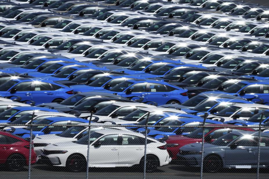 Japansk eksport, her illustrert ved biler som står klare til å bli sendt ut av landet fra et havneanlegg i Yokohama tidligere i år, har falt til det laveste nivået på fire år. Foto: Hiro Komae / AP / NTB
