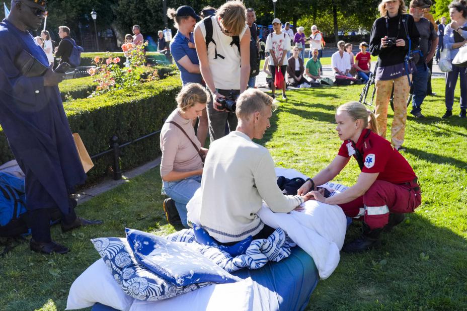 Vebjørn Bjelland Berg fikk tilsyn av ambulansepersonell tirsdag ettermiddag. På kvelden ble han fjernet av politiet, men natt til onsdag var han tilbake. Foto: Terje Bendiksby / NTB