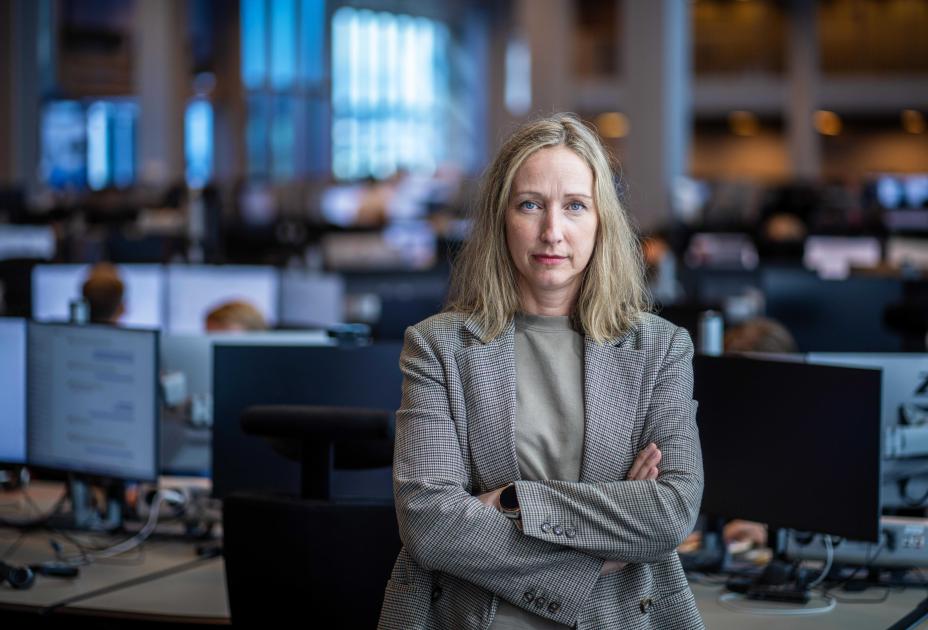 Sjeføkonom i DNB Markets Kjersti Haugland fotografert i meglerrommet til DNB i Oslo mandag formiddag. Hovedindeksen på Oslo Børs var i fritt fall i de første sekundene etter åpning mandag morgen. Foto: Ole Berg-Rusten / NTB