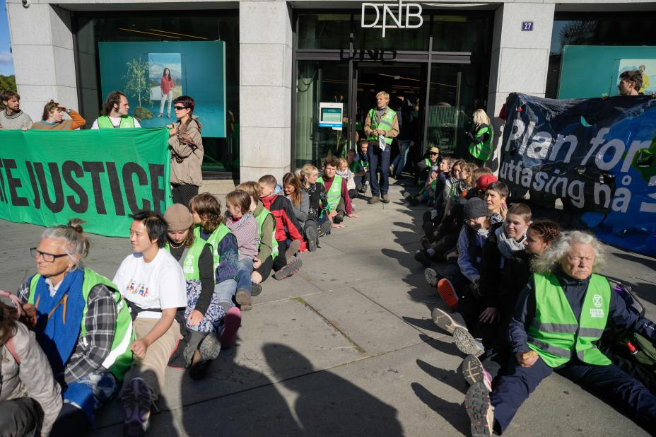 Extinction Rebellion aksjonerer torsdag utenfor DNBs lokaler i Karl Johans gate i Oslo. Foto: Javad Parsa / NTB