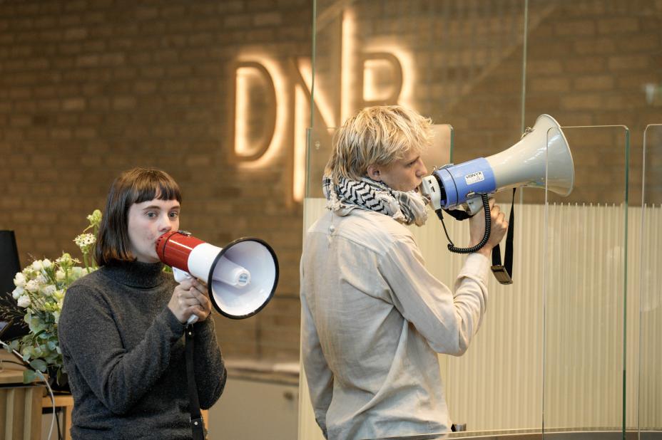 Extinction Rebellion aksjonerer fredag morgen inne på DNBs hovedkontor i Dronning Eufemias gate i Oslo. Foto: Stian Lysberg Solum / NTB