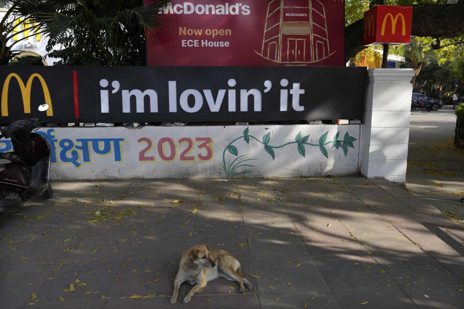 En løshund ligger utenfor en McDonalds i New Delhi. Foto: Manish Swarup / AP / NTB