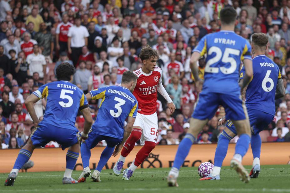 Max Dowman fikk på seg mange Leeds-spillere, men danset forbi dem i Premier League-debuten for Arsenal. Foto: Ian Walton / PA / NTB