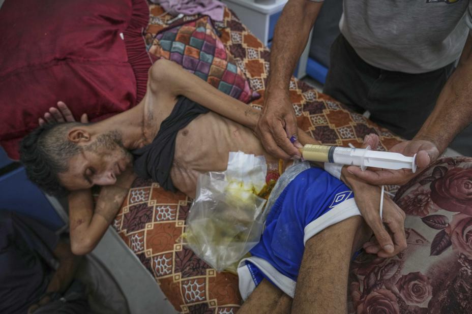 Atef Arhouma gir sønnen Karam Akoumeh (22) mat gjennom sprøyte ved sykehuset Shifa i Gaza by. Akoumeh viser tegn på underernæring, fastslår legene ved sykehuset. Bare i løpet av 24 timene etter at FN kunngjorde hungersnød, døde åtte personer i Gaza av underernæringsrelaterte årsaker. Siden krigen startet er det nå registrert 281 dødsfall som følge av underernæring, ifølge Gazas helsedepartement. Foto: Abdel Kareem Hana / AP / NTB