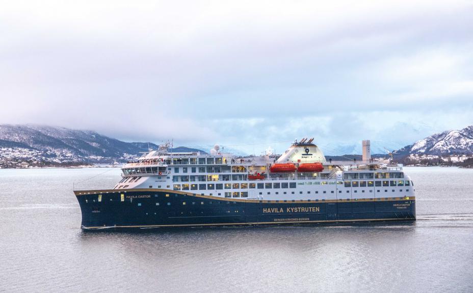 Her er kystruteskipet MS Havila Castor på vei inn til Ålesund. Foto: Halvard Alvik / NTB