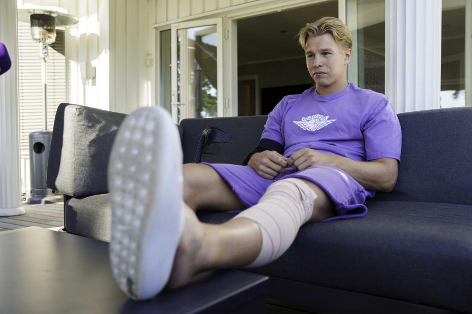 Markus Rooth med bandasjert kne i stua hjemme på Bekkelaget etter skaden som kostet ham VM og resten av sesongen. Nå er han operert. Foto: Cornelius Poppe / NTB