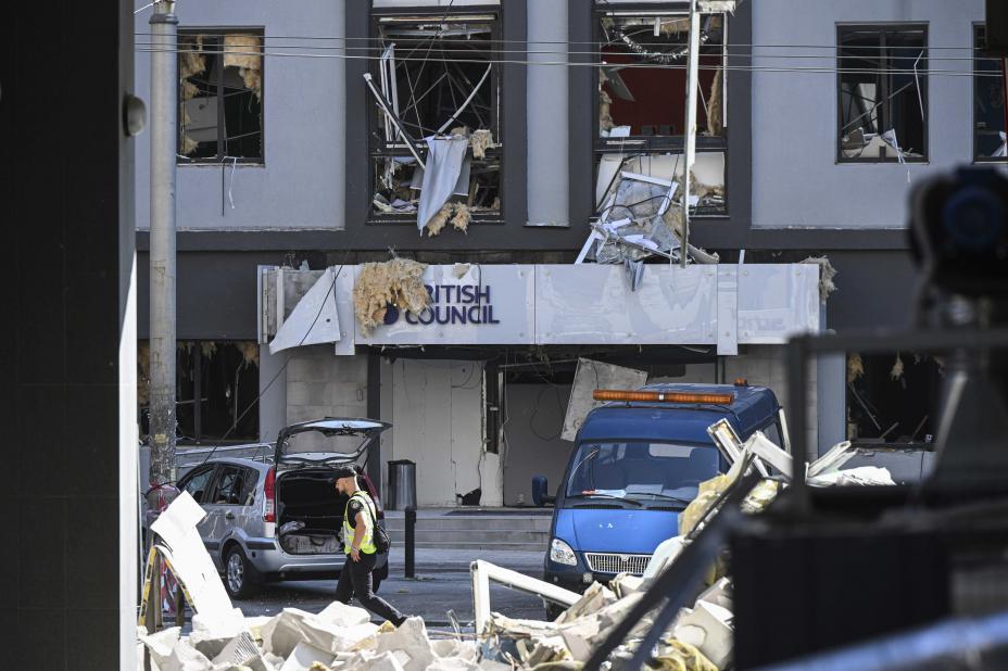 British Councils bygning i Kyiv sentrum ble truffet av et av de mange russiske rakett- og droneangrepene mot den ukrainske hovedstaden torsdag morgen. Foto: Danylo Antoniuk / AP / NTB