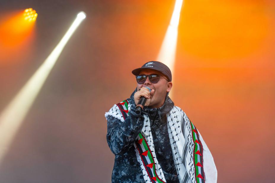 Hiphop-trioen Kneecap har markert sterkt støtte til palestinerne og fra scenen kritisert Israels krigføring i Gaza, som her under Øyafestivalen i Oslo. Slike ytringer fra kjendiser påvirker imidlertid i liten grad folks syn på politiske saker, viser britisk undersøkelse. Foto: Thomas Fure / NTB
