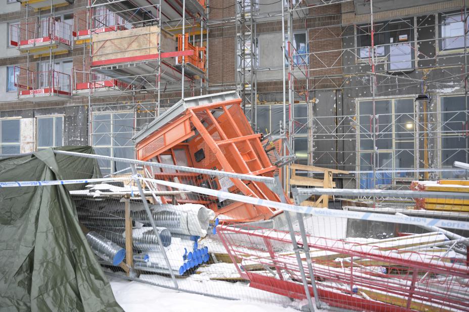 Anleggsheisen på byggeplassen i Ursvik i Sundbyberg raste ned omtrent 30 meter, ifølge påtalemyndigheten. Foto: Fredrik Sandberg/TT / NTB