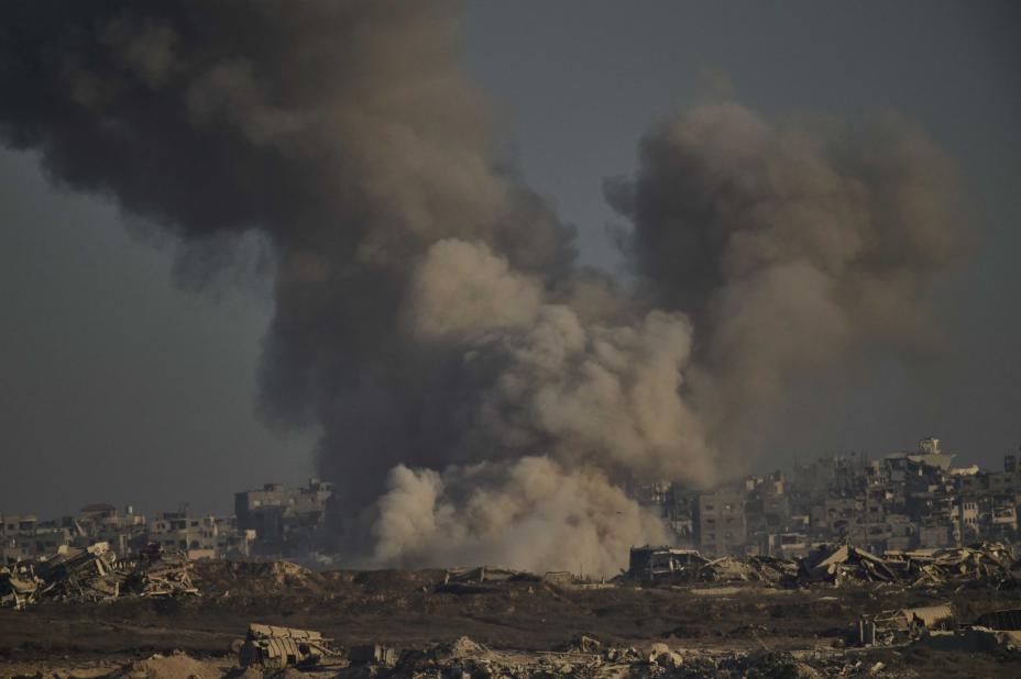 Tjukk røyk stiger til værs etter en eksplosjon som følge av et israelsk luftangrep i Nord-Gaza lørdag, sett fra israelsk side av grensa. Foto: Leo Correa / AP / NTB