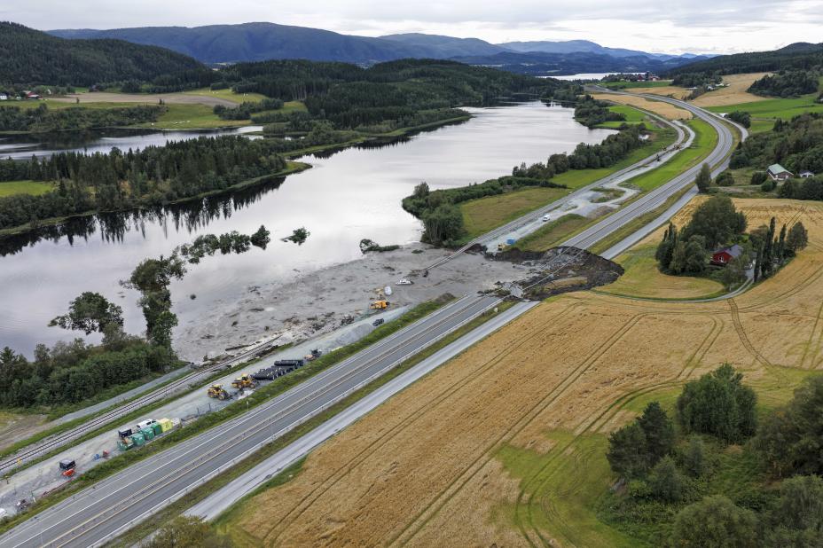 En person er tatt av ras som gikk over E6 i Levanger. En bil har havnet i vannet, og et hus står i fare. Foto: Ole Martin Wold / NTB
