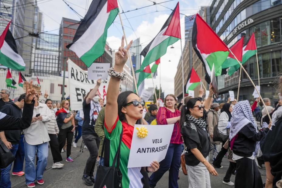 Demonstranter marsjerer gjennom Oslos gater i en nasjonal markering til støtte for Palestina. Foto: Javad Parsa / NTB