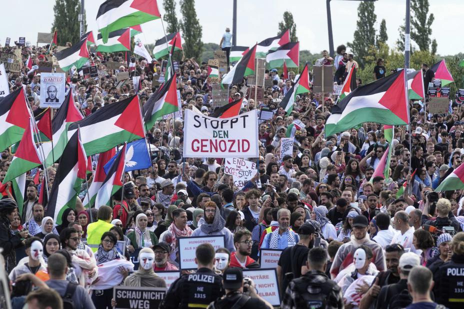 Flere tusen mennesker deltok lørdag i en demonstrasjon i Frankfurt mot Gaza-krigen etter at retten opphevet forbudet som myndighetene innførte. Foto: Michael Probst / AP / NTB