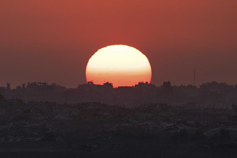 Solen går ned bak bygninger ødelagt under israelske bakke- og luftoperasjoner på Gazastripen. Foto: Maya Levin / AP / NTB