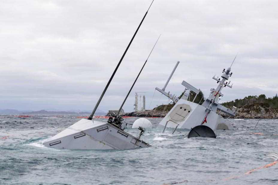 Bilde er av KNM Helge Ingstad som i 2018 kolliderte med et tankskip og forlisete. Nå skal det investeres i nye fregatter. Foto: Cornelius Poppe / NTB
