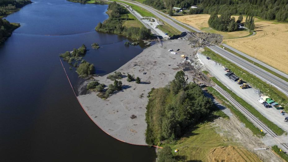Dronebilde over raset ved Nesvatnet utenfor Levanger. Nå vil Bane Nor gå gjennom beslutningsprosessen som lå til grunn for plassering av krysningssporet. Foto: Jan Langhaug / NTB