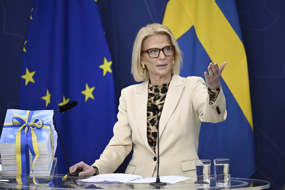 Sveriges finansminister Elisabeth Svantesson (M) foreslår å kutte matmomsen til 6 prosent, ifølge den svenske allmennkringkasteren. Foto: Pontus Lundahl / TT / AP / NTB