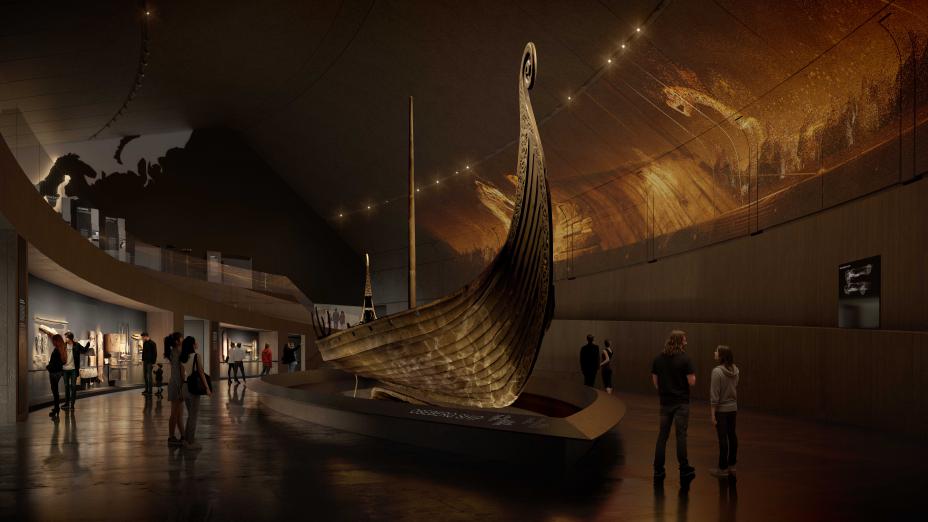 Det 1200 år gamle Osebergskipet skal flyttes. Men det skjøre og porøse treverket gjør flytteprosessen til en særdeles krevende ingeniøroppgave. Slik kommer det til å se ut i det nye museet. Foto: Vikingtidsmuseet / Ralph Appelbaum Associates & Tamschick Media / Space / Handout / NTB
